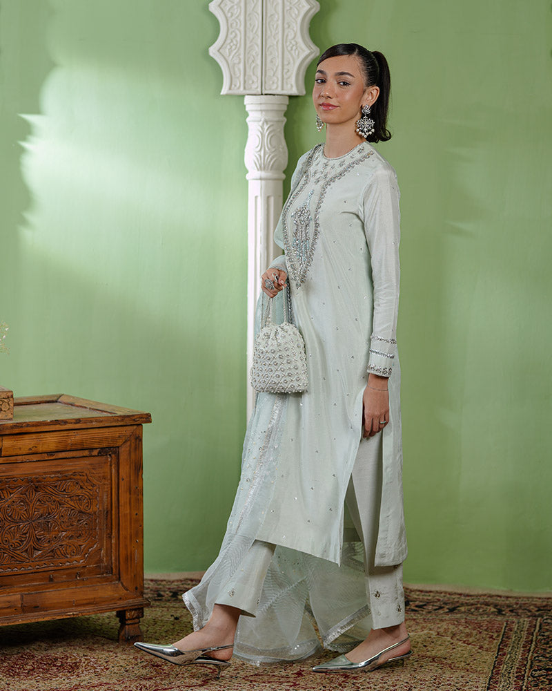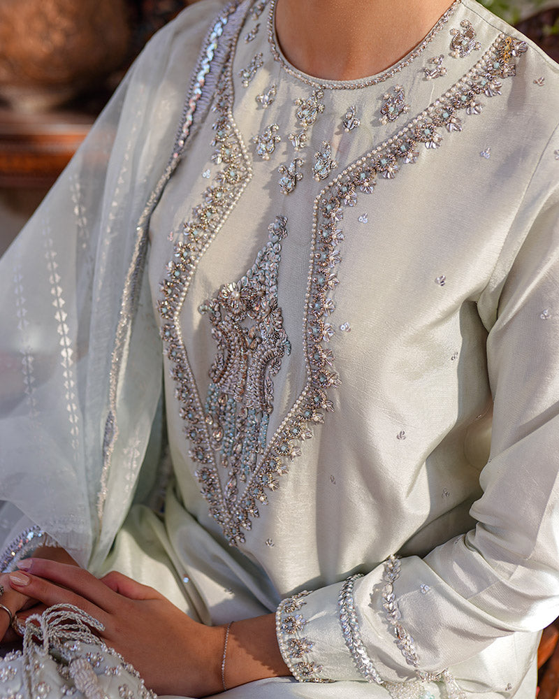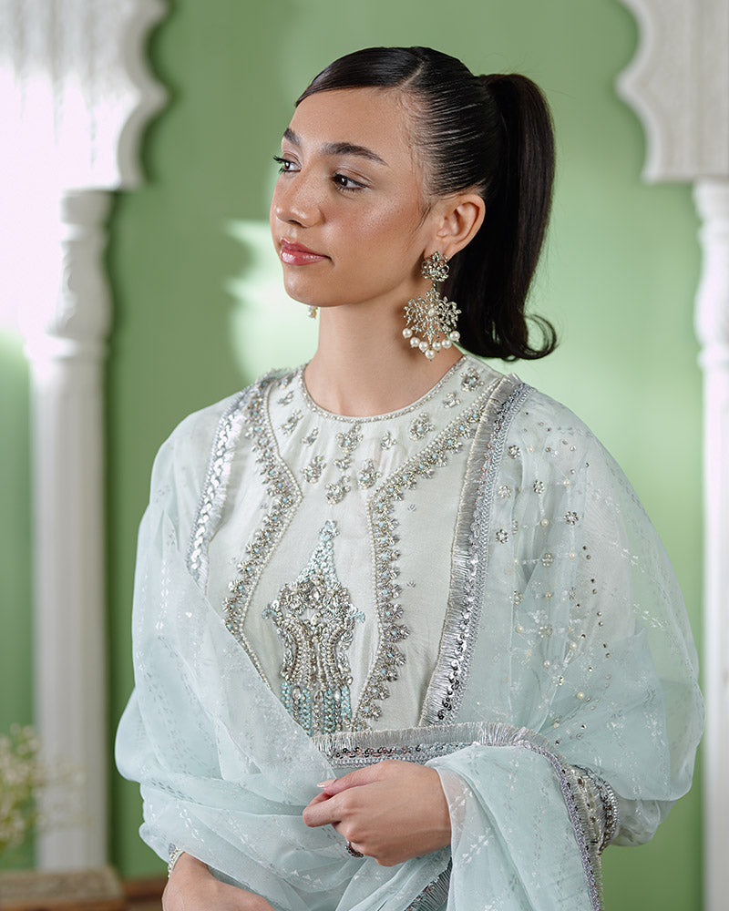 Exuding elegance and grace, this ethereal ice blue ensemble is a perfect combination of sophistication and timeless charm. Crafted with intricate silver embellishments and delicate crystal and pearl work, this outfit is designed for festive and formal occasions, making it an ideal choice for those who appreciate understated luxury.