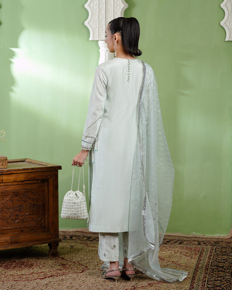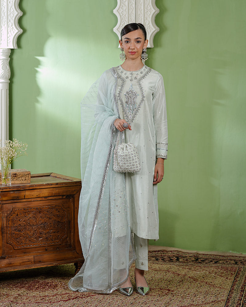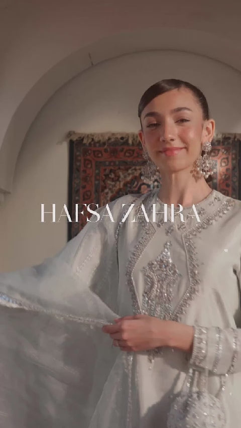 • Dupatta: A block printed organza dupatta, delicately embroidered with scattered sequins and silver accents, finished with a shimmering silver border to add an ethereal touch.