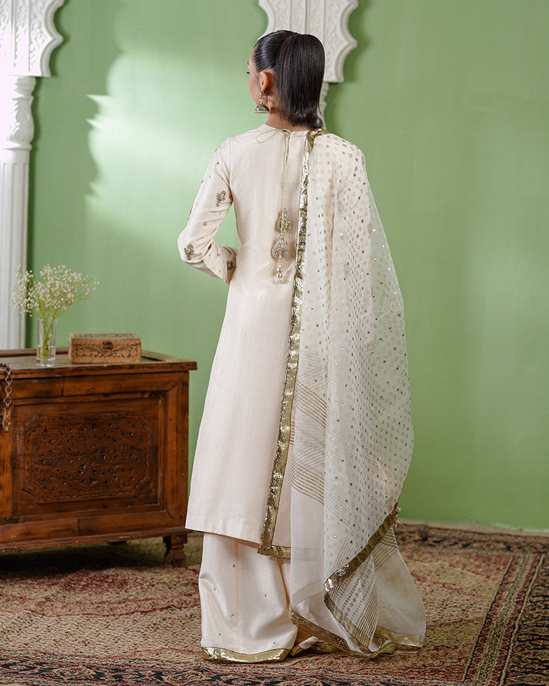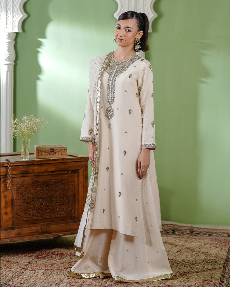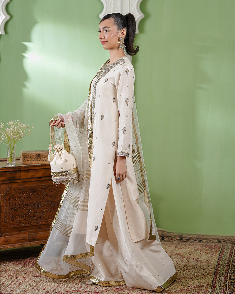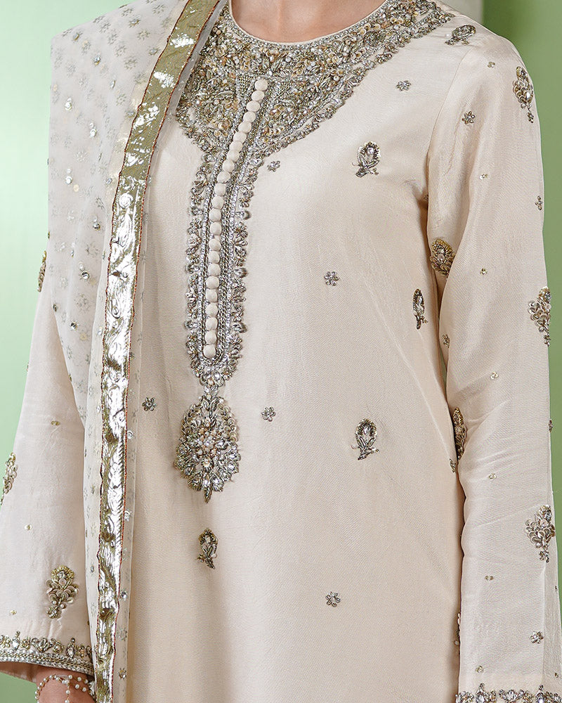 • Shirt: A straight-cut ivory shirt adorned with delicate gold embellishments, and intricate tilla and dabka hand embellishment on the neckline and sleeves. The structured silhouette is enhanced with premium net fusing, ensuring a sharp and polished look.
