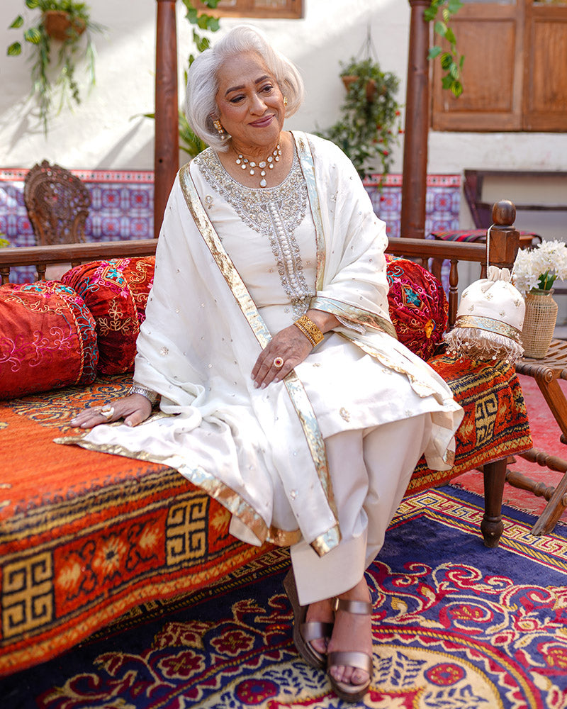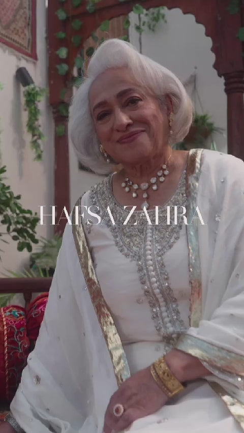 A vision of timeless grace, this handcrafted ivory ensemble is designed to exude sophistication and elegance. Embellished with intricate handwork and shimmering details, this outfit is a perfect blend of classic and contemporary, making it an ideal choice for festive and formal occasions.