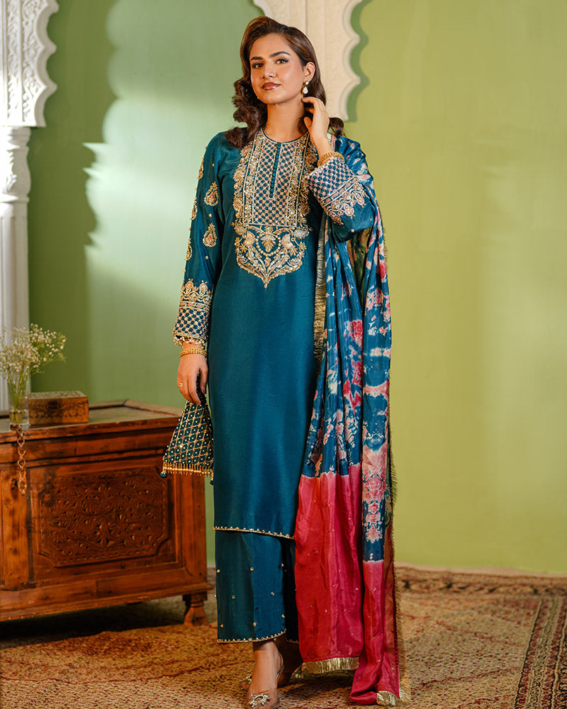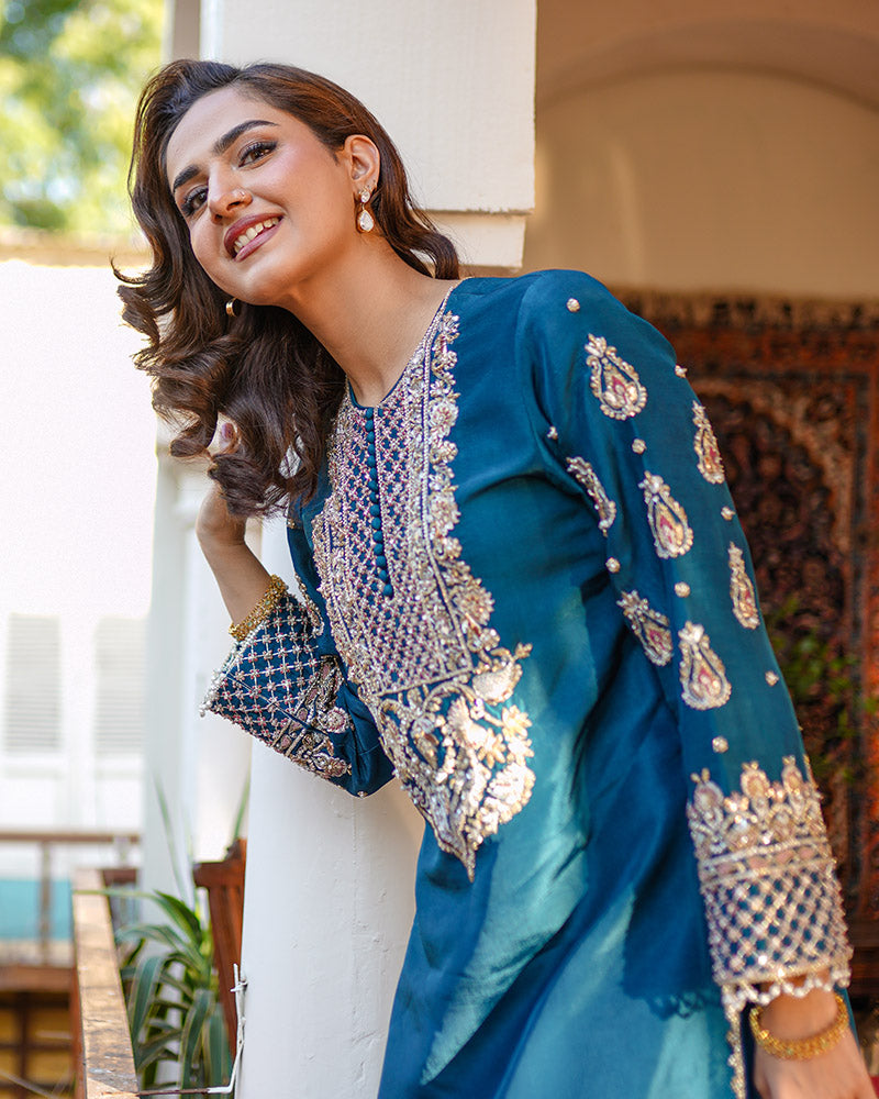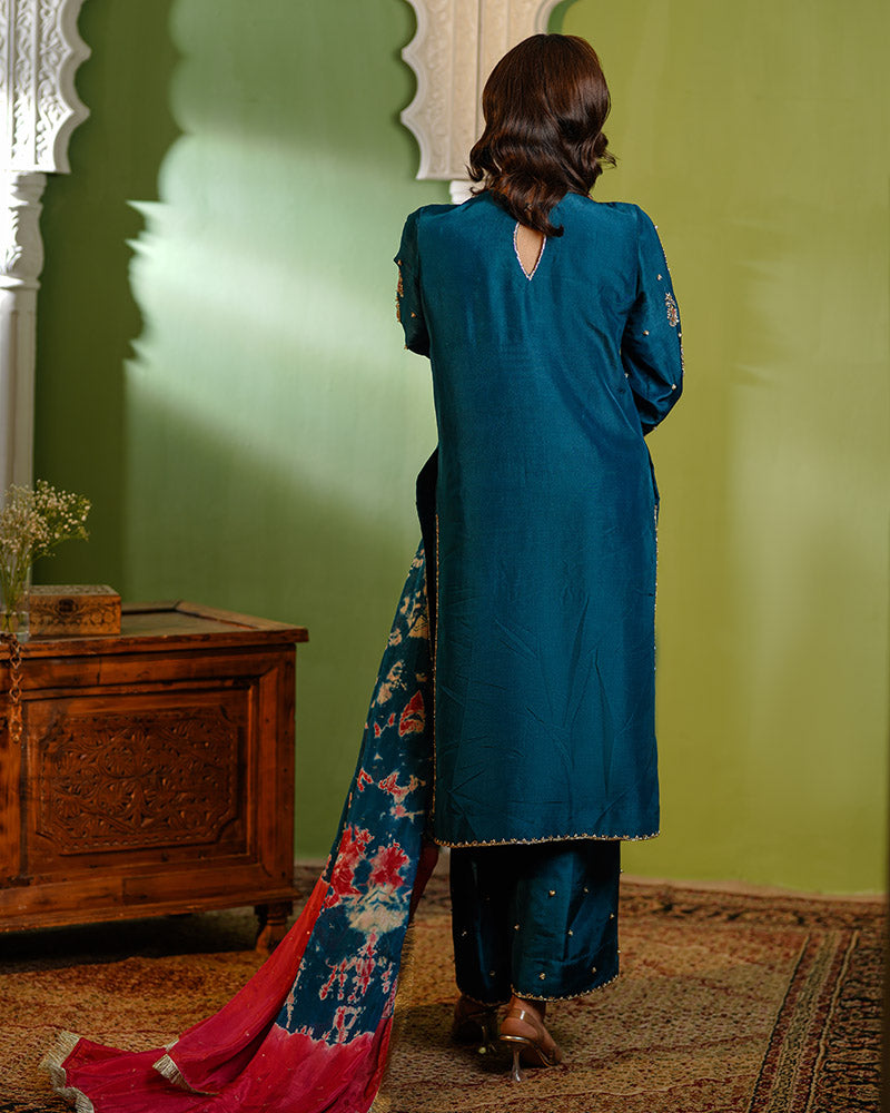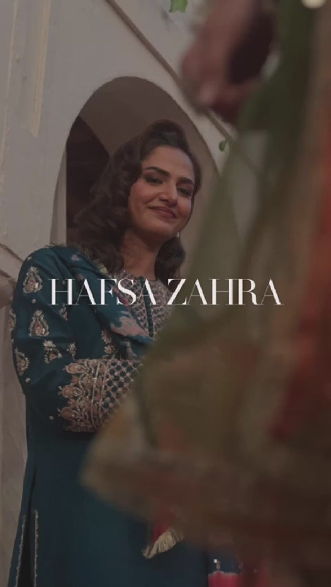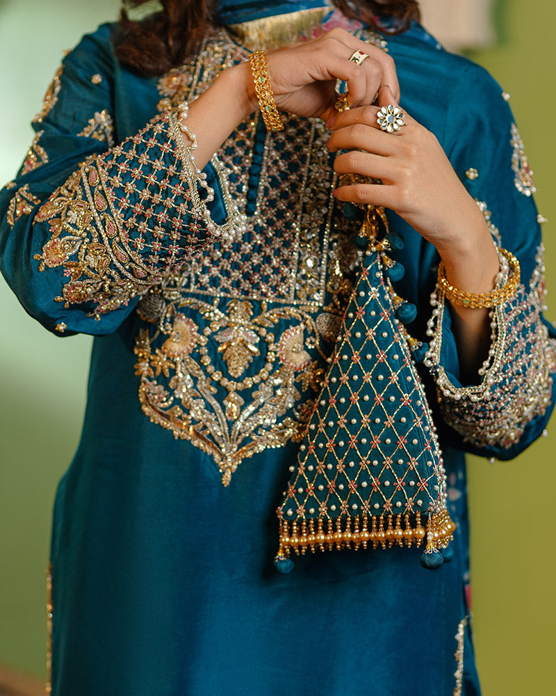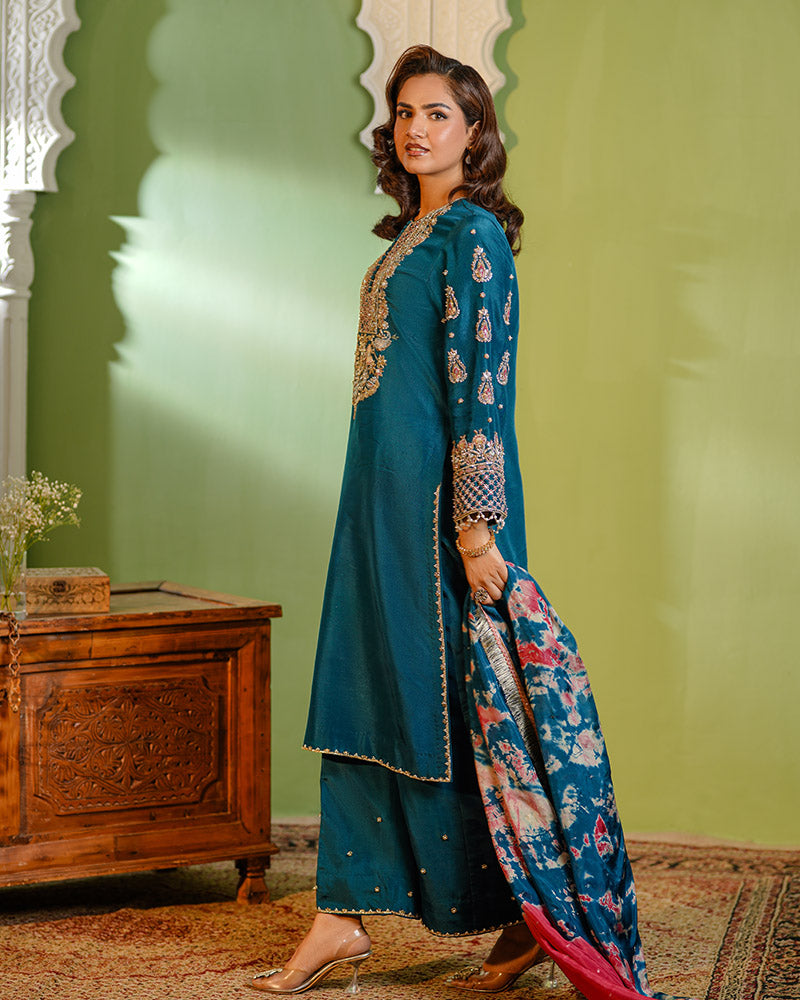 This fully handmade teal ensemble blends tradition with modern elegance, featuring intricate embroidery and premium craftsmanship. Designed for festive and formal occasions, it offers luxury with every detail.