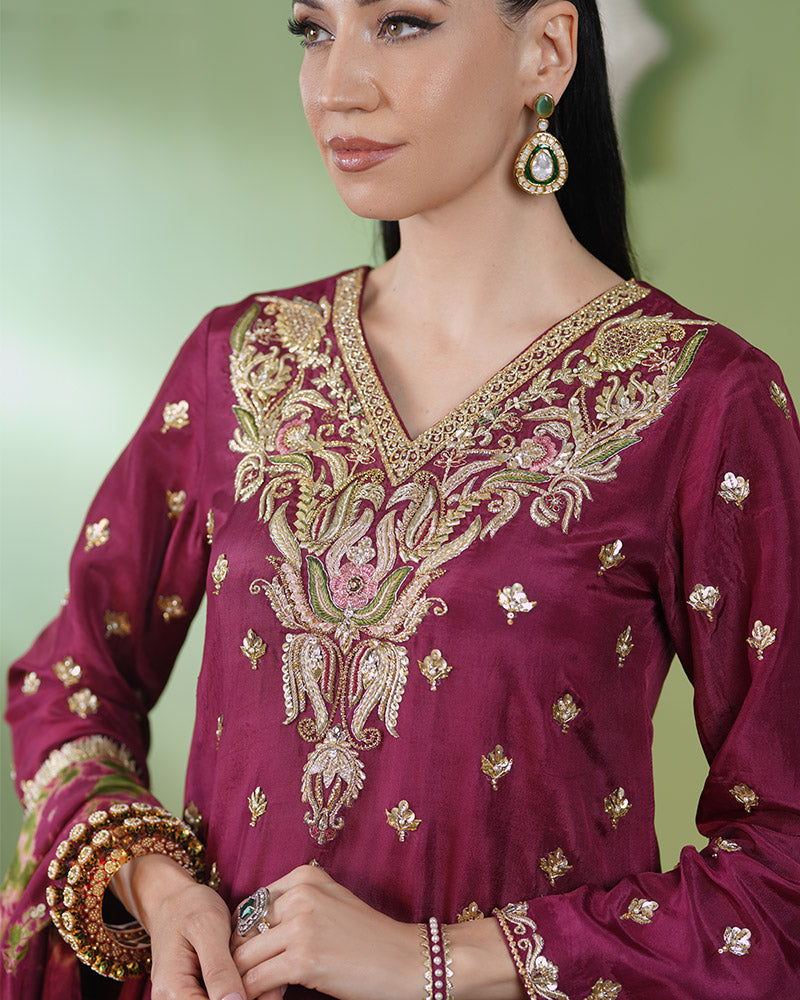 • Shirt: A plum-hued straight long shirt with exquisite golden tilla and beautiful resham thread embroidery, Mukesh work, gotta lappa and intricate embellishments on the neckline, sleeves, and hem. The delicate handcrafted motifs elevate the traditional aesthetic, while premium net fusing ensures a structured, crisp look.