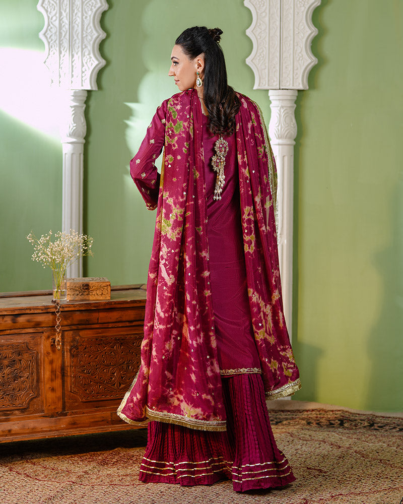 • Dupatta: A medium silk tie-dye dupatta in complementing tones, adorned with a