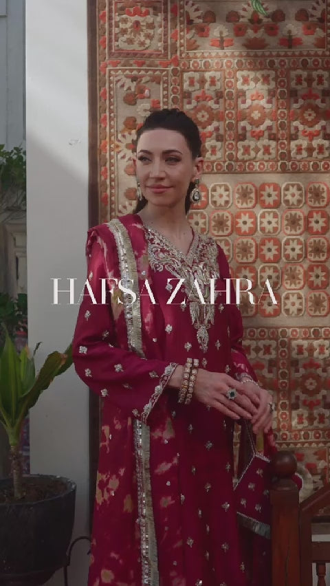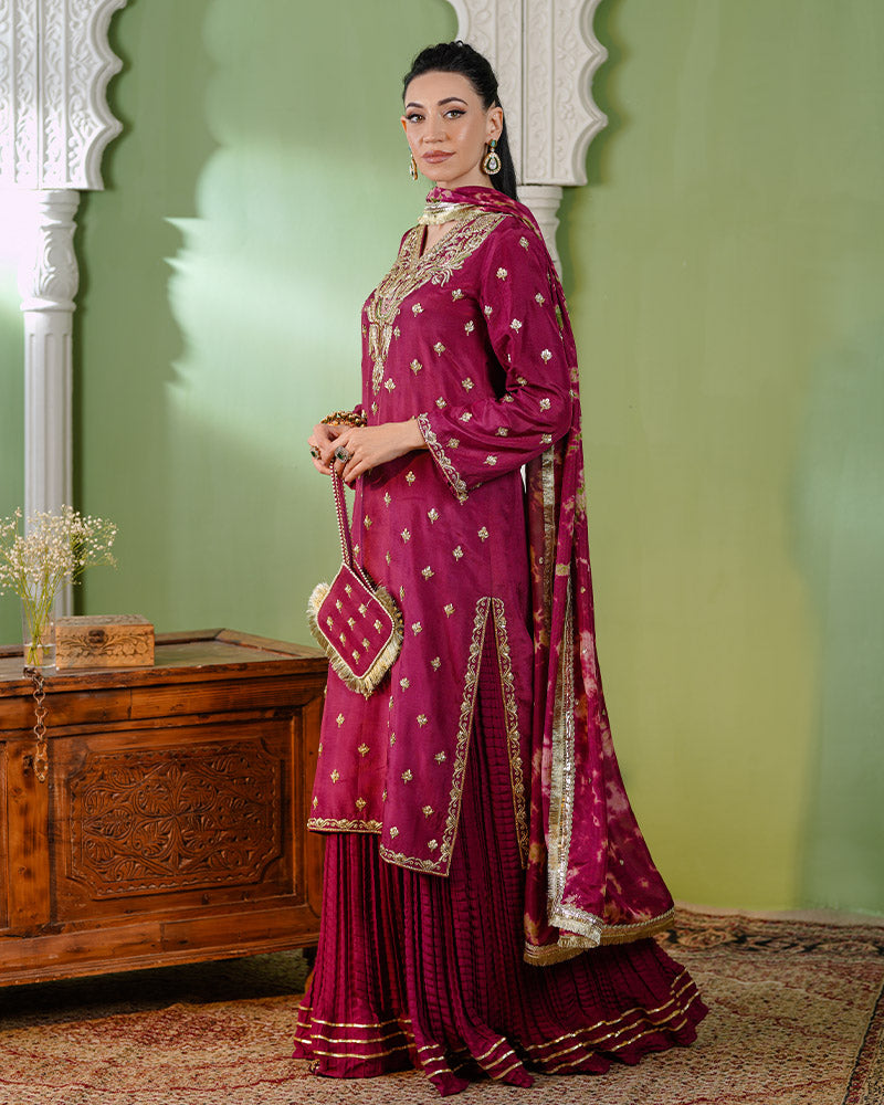 • Trouser: Flowing crushed gharara pants with fine golden trims, offering both comfort and grandeur.