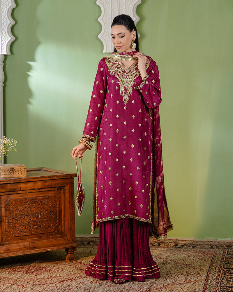 A timeless blend of tradition and elegance, this handcrafted plum-toned outfit is designed to exude regal charm. Intricate embroidery, rich embellishments, and premium fabric choices make this ensemble perfect for festive and formal occasions.